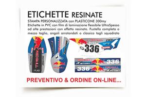 Etichette in PVC adesivo ad effetto resinato. Stampate e fustellate in tutte le forme, per interni od esterni, con taglio a fustella completa o mezzotaglio, angoli arrotondati o classico taglio squadrato, stampate su adesivo permanente lunga durata oppure ultraTack, per superfici piu' difficili e per una miglior garanzia di tenuta, le stampe sono abbinate ad un film di laminazione flessibile UltraSpesso da 300my ad alta trasparenza e ad alte prestazioni cosi' da ottenere l'effetto resinato. La pellicola funge da barriera protettiva per le grafiche sportive (bici e moto da corsa, moto da cross, kart) e le etichette da apporre sui macchinari, garantendo la massima brillantezza per applicazioni esposte ad alti livelli di abrasione.